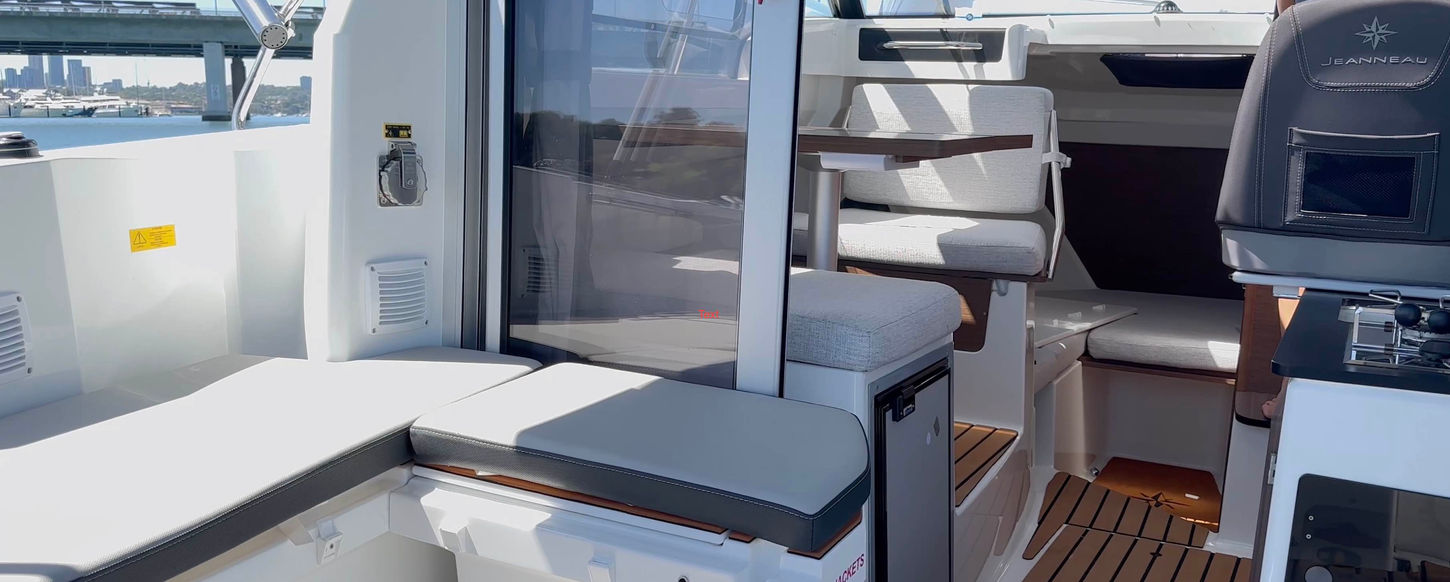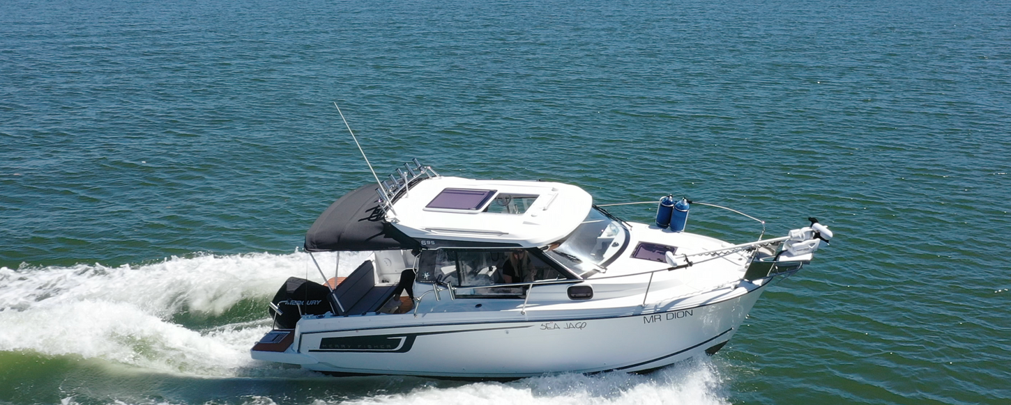 large storage lockers, a small galley with a refrigerator, two forward berths, a saloon that converts into an additional berth, a separate marine head under the helm station, an L-shaped exterior cockpit, and wide swim platforms… And there is one more advantage to this model, already capable of so much: it is trailorable and can easily be stored in dry dock storage.